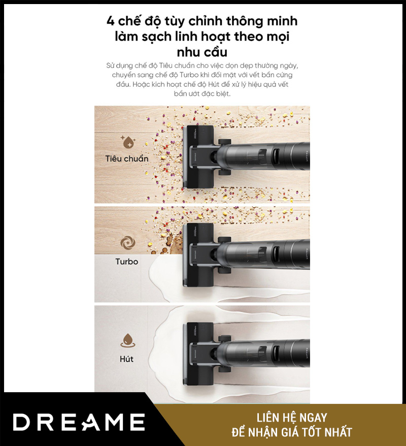 Không phải lúc nào ngôi nhà cũng cần làm sạch theo cùng một cách. Hiểu điều đó, Dreame G10 được trang bị 4 chế độ làm sạch linh hoạt, đáp ứng đa dạng nhu cầu sử dụng: