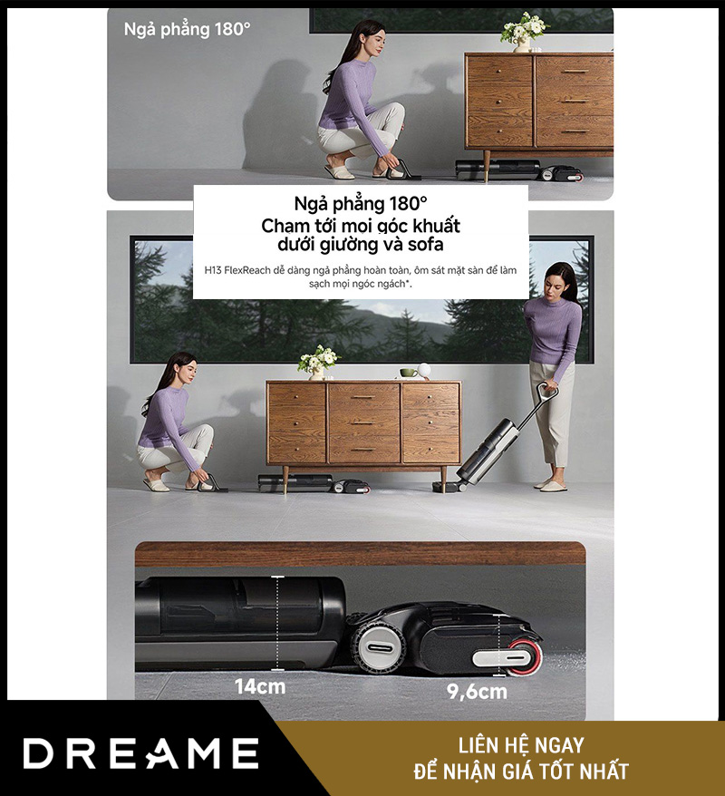 Điểm cộng lớn của Dreame H12 FlexReach chính là khả năng ngả phẳng 180°, giúp máy: