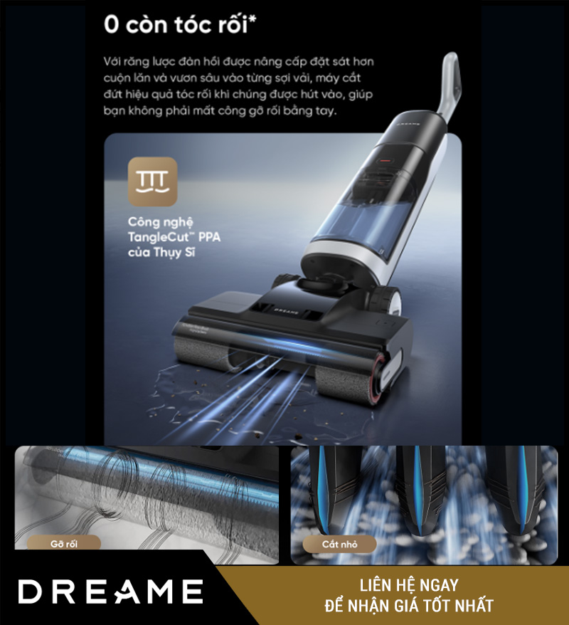 Một trong những điểm thường gây khó chịu khi sử dụng máy hút bụi lau nhà là tóc dài và lông thú cưng quấn quanh trục cuộn lăn. Với H14 Station, Dreame đã giải quyết triệt để vấn đề này nhờ: