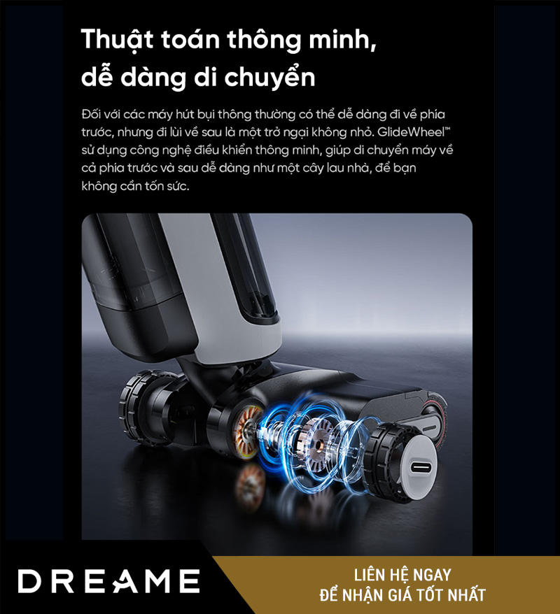 Dreame H14 Station được trang bị hệ thống bánh xe trợ lực GlideWheel™ – công nghệ giúp di chuyển nhẹ nhàng, linh hoạt và êm ái trên nhiều bề mặt: