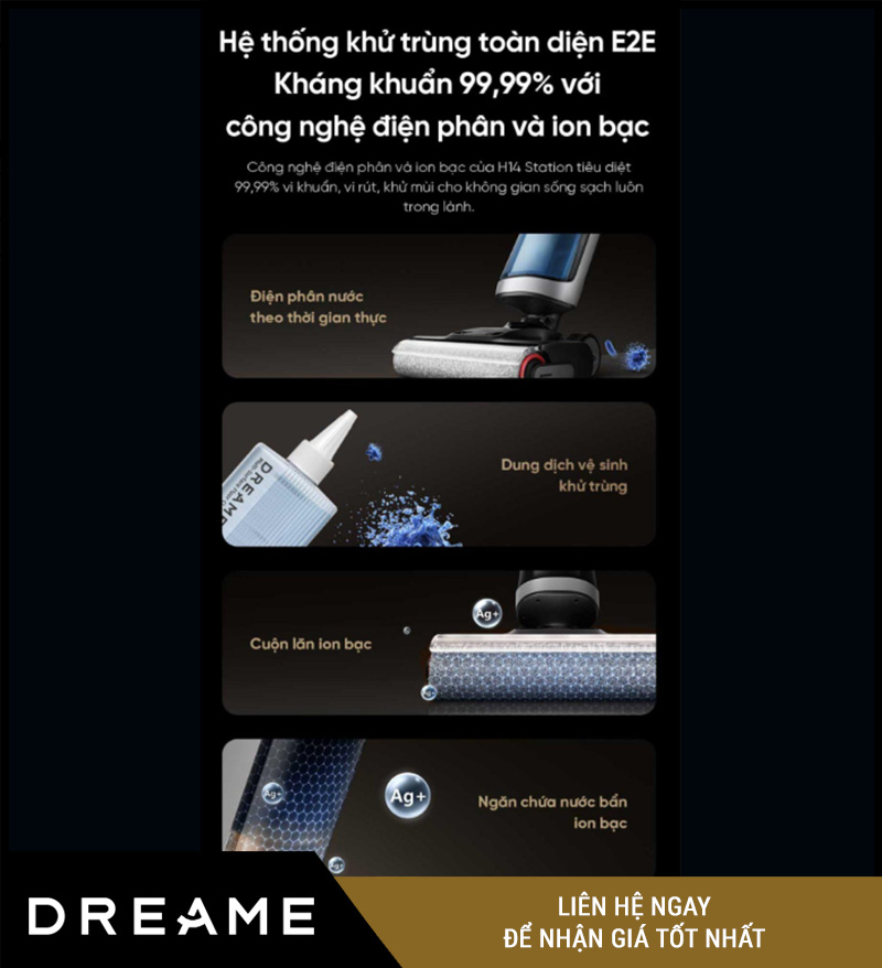 Dreame H14 Station không chỉ dừng lại ở việc làm sạch bề mặt mà còn tích hợp hệ thống khử trùng E2E (End-to-End) sử dụng công nghệ điện phân và ion bạc (Ag⁺) – mang đến hiệu quả kháng khuẩn vượt trội lên đến 99,99%.