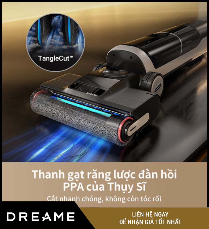Một trong những nỗi ám ảnh khi vệ sinh sàn là tóc dài – lông thú cưng bị quấn vào con lăn, gây tắc nghẽn và giảm hiệu suất máy. Dreame H14 Ultra khắc phục hoàn toàn vấn đề này với thiết kế TangleCut™ – răng lược chống rối thông minh.