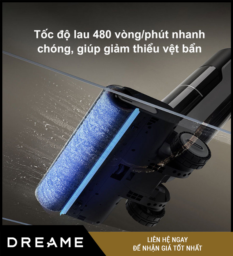 Dreame H14 Ultra tích hợp hệ thống lau xoay tốc độ cao 480 vòng/phút, giúp đánh bật vết bẩn nhanh và tránh để lại vệt nước loang trên sàn sau khi lau.
