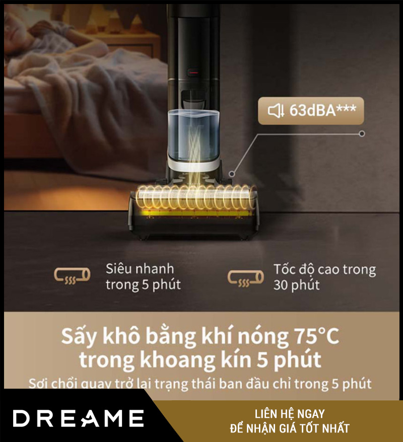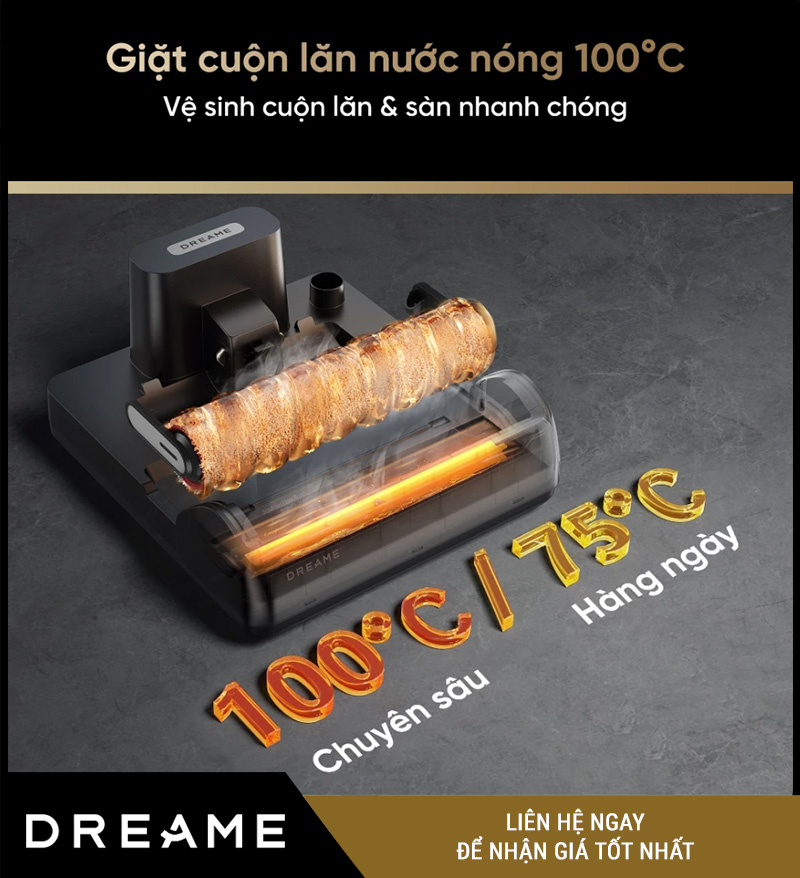 Không chỉ lau sàn bằng nước nóng, Dreame H14 Ultra còn có khả năng tự giặt cuộn lăn bằng nước nóng 100°C, kết hợp với hệ thống sấy khô khí nóng 75°C sau mỗi chu trình.