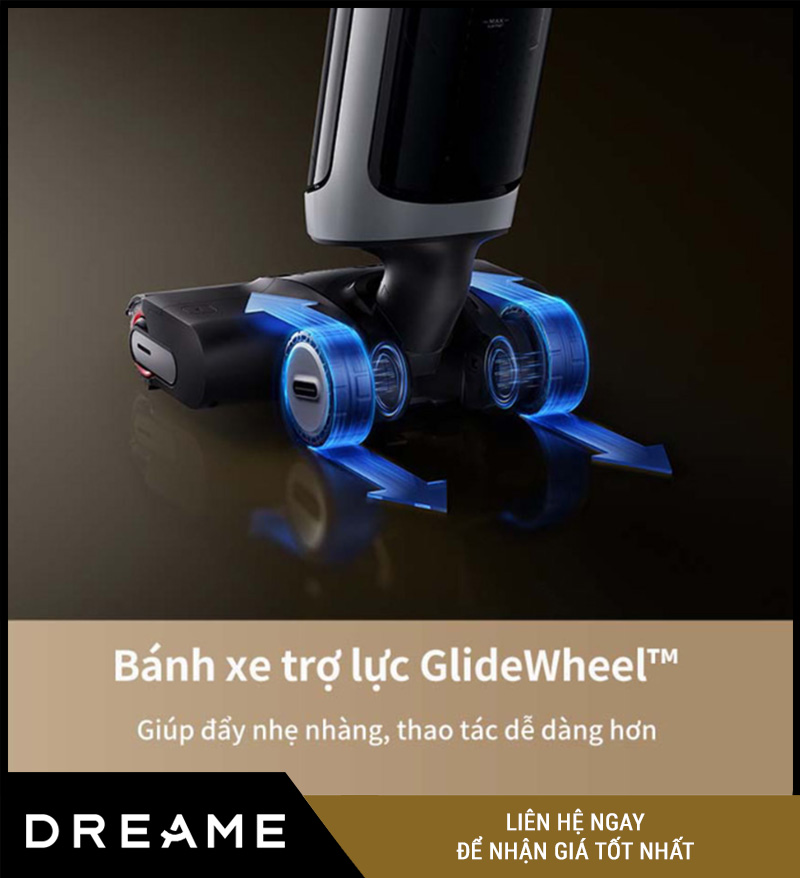 Dreame H14 Ultra được trang bị hệ thống GlideWheel™ – bánh xe trợ lực thông minh, giúp giảm ma sát khi đẩy máy, mang lại trải nghiệm di chuyển êm ái và dễ dàng.
