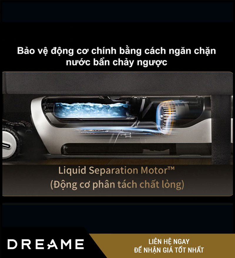 Dreame H14 Ultra được trang bị động cơ thông minh Liquid Separation Motor™, giúp tách biệt bụi khô và nước bẩn ngay từ đầu vào, tránh tình trạng hỗn hợp chất bẩn làm giảm hiệu suất hoặc gây hỏng thiết bị.