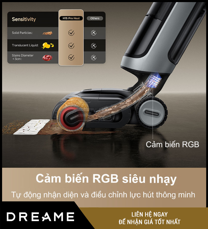 Dreame H15 Pro Heat được tích hợp cảm biến RGB thông minh, hoạt động như “đôi mắt AI” giúp máy tự đánh giá độ bẩn và chất liệu sàn theo thời gian thực.