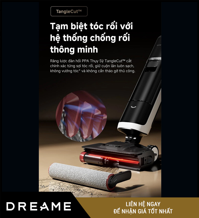 Một trong những vấn đề phổ biến với các máy hút bụi truyền thống là tóc và lông thú cưng quấn vào chổi lăn, gây nghẽn, giảm lực hút và mất nhiều thời gian vệ sinh. Dreame H15 Pro Heat khắc phục hoàn toàn nhược điểm này nhờ công nghệ chống rối TangleCut™.