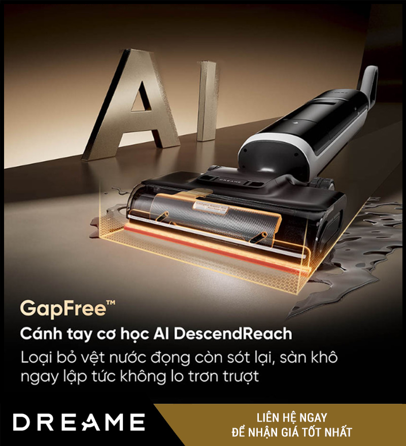 Một nhược điểm lớn của máy hút lau truyền thống là khó tiếp cận viền chân tường, góc cạnh, gầm hẹp. Dreame H15 Pro Heat giải quyết triệt để nhờ công nghệ cánh tay cơ học AI DescendReach™.
