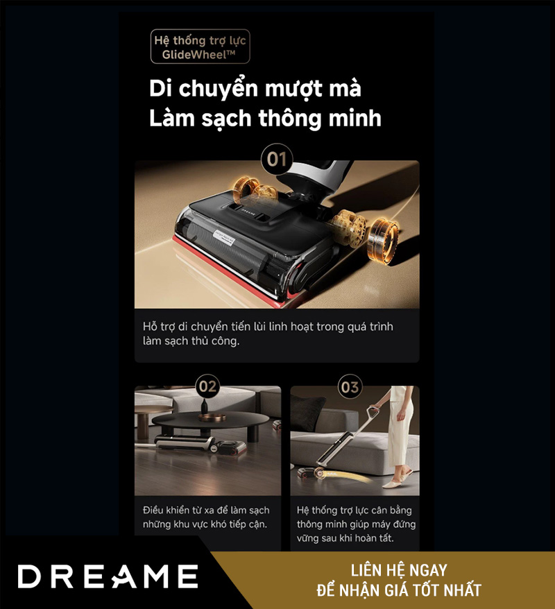 Không giống những máy hút lau cầm tay truyền thống gây nặng và mỏi tay khi dùng lâu, Dreame H15 Pro Heat tích hợp hệ thống bánh xe trợ lực thông minh GlideWheel™.