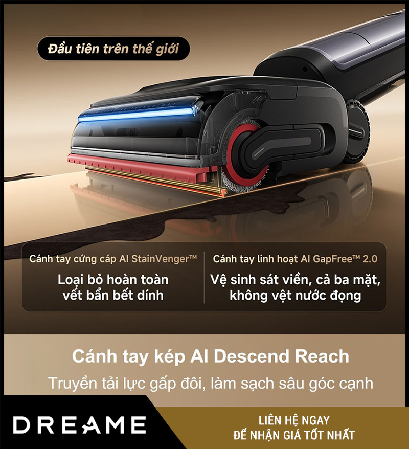 Descend Reach là cơ chế “robot AI cánh tay kép” trên Dreame H16 Pro Steam, giúp đầu lau tự điều chỉnh để bám sát bề mặt và sát cạnh, giảm tình trạng sót mép tường/chân tủ và tăng hiệu quả khi gặp mảng bẩn bám dai.