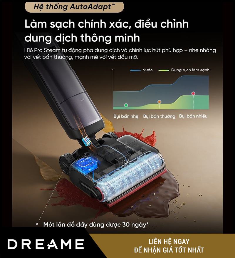 AutoAdapt™ Cleaning System trên Dreame H16 Pro Steam là hệ thống “tự thích nghi” trong giai đoạn vệ sinh–sấy cuộn lăn, dùng cảm biến độ ẩm để kiểm soát quá trình làm khô chính xác hơn.