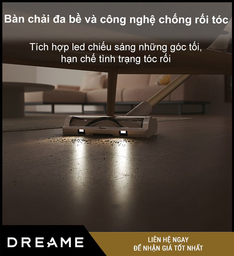 Dreame R10 được trang bị đầu hút chính với bàn chải chữ V đa bề mặt, tối ưu khả năng tiếp xúc và làm sạch sâu trên nhiều loại sàn. Tích hợp hệ thống đèn LED chiếu sáng, máy giúp phát hiện bụi bẩn ẩn dưới gầm bàn, giường hoặc những nơi thiếu sáng. Ngoài ra, công nghệ chống rối tóc thông minh hạn chế tình trạng tóc và lông thú bị cuốn quanh chổi, giúp máy hoạt động trơn tru và giảm thiểu thời gian bảo dưỡng.