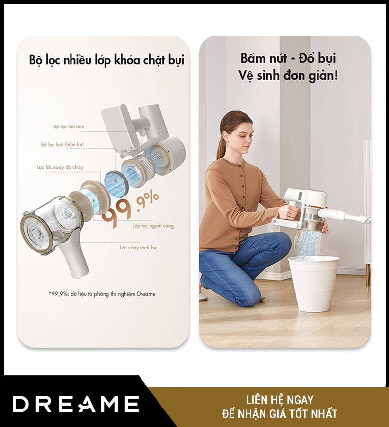 Dreame R10 được trang bị hệ thống lọc 5 tầng tiên tiến, bao gồm lưới lọc kim loại, bộ lọc lốc xoáy, bộ lọc HEPA và lớp lọc bọt biển. Cấu trúc này giúp giữ lại tới 99,9% bụi mịn và các hạt siêu nhỏ như phấn hoa, vi khuẩn, lông thú cưng, ngăn không cho chúng quay trở lại không khí. Nhờ vậy, không gian sống luôn sạch thoáng, an toàn hơn cho người bị dị ứng hoặc gia đình có trẻ nhỏ.