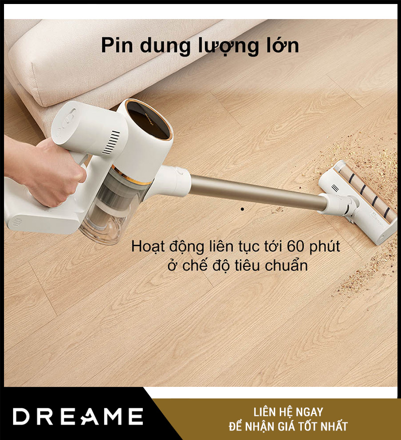 Dreame R10 sở hữu viên pin dung lượng cao, cho thời gian hoạt động liên tục lên đến 60 phút ở chế độ Eco. Người dùng hoàn toàn có thể vệ sinh toàn bộ căn hộ hoặc ngôi nhà nhiều tầng chỉ với một lần sạc. Ngoài ra, pin còn được thiết kế tháo rời, giúp thay thế dễ dàng khi cần, kéo dài tuổi thọ cho thiết bị.