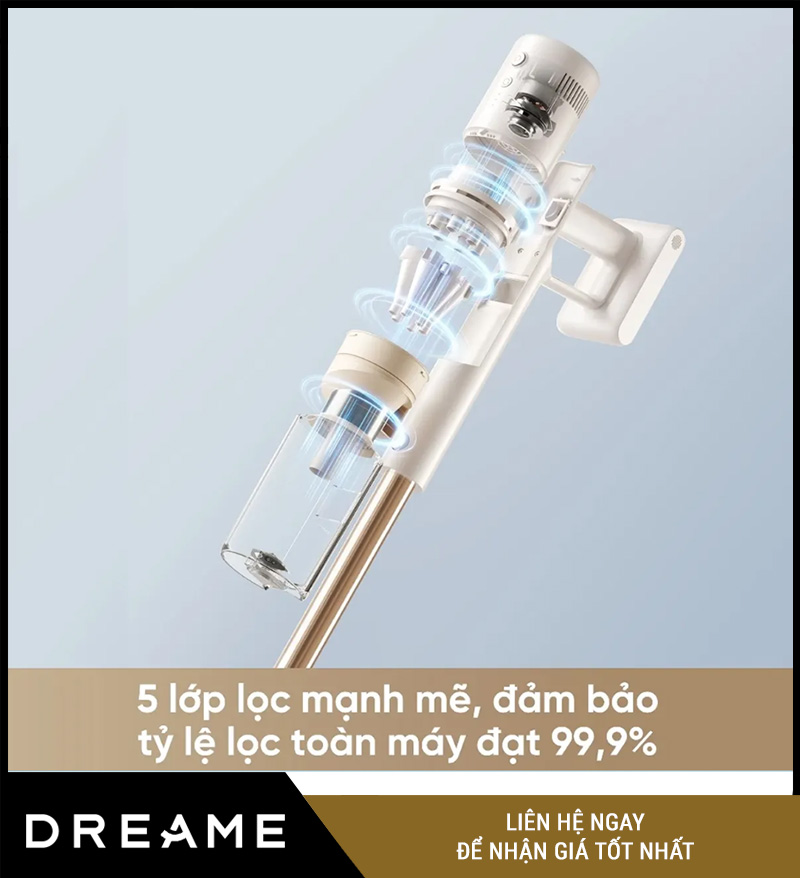 Máy được trang bị hệ thống lọc 5 tầng tiên tiến, giúp giữ lại tới 99,97% bụi mịn và các hạt siêu nhỏ có kích thước chỉ 0.3 micron. Không chỉ đảm bảo sàn nhà sạch bóng, Dreame V11 Pro còn giúp lọc sạch không khí, mang lại môi trường sống an toàn và trong lành cho cả gia đình, đặc biệt phù hợp với những người dễ dị ứng hoặc có trẻ nhỏ.