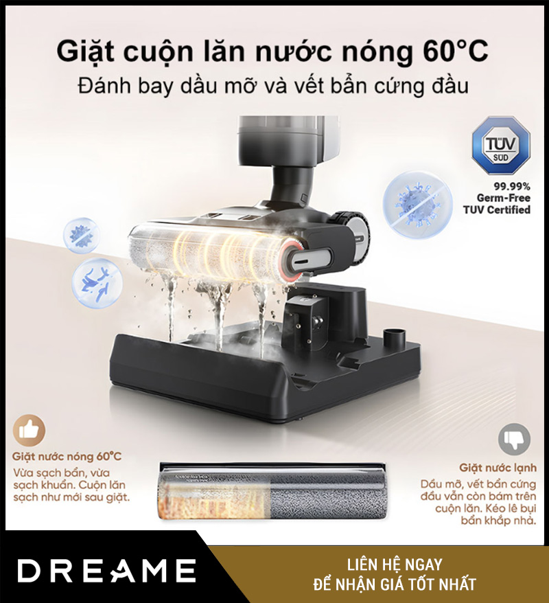 Tự giặt và sấy con lăn bằng nước nóng 60 °C: hạn chế tối đa thao tác thủ công, đảm bảo vệ sinh.