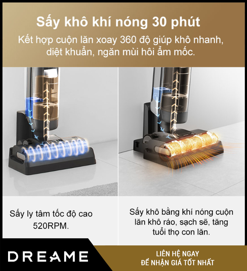 Sấy khô bằng khí nóng (~30 phút): Sau khi giặt, máy thổi khí nóng để con lăn khô ráo, ngăn ẩm mốc và mùi hôi.