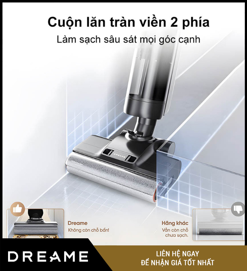 Con lăn tràn viền hai bên – thiết kế đặc biệt cho phép máy tiếp xúc sát mép tường, tủ, chân bàn, những nơi mà nhiều máy hút lau truyền thống thường bỏ sót.