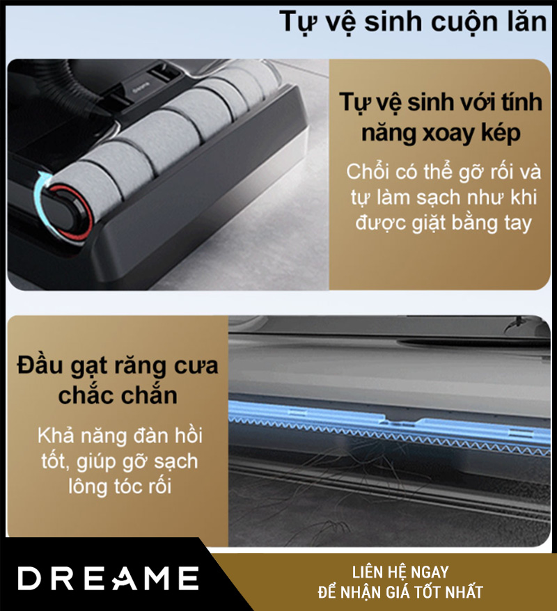 Tự loại bỏ tóc, sợi vải nhờ cơ chế xoay đảo chiều của con lăn và răng lược cạo rác.