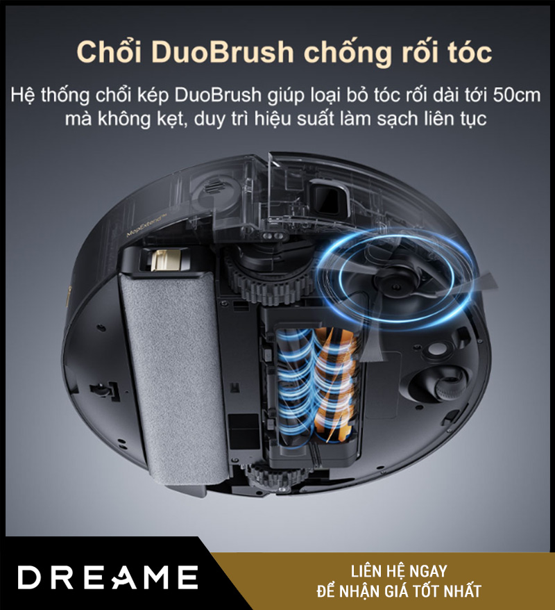 Một vấn đề gây “ám ảnh” với người dùng robot hút bụi là tóc rối và lông thú quấn vào chổi, gây kẹt máy và giảm hiệu suất làm sạch. Nhưng với Detangling DuoBrush – hệ thống chổi kép thông minh, Dreame Aqua 10 Pro Track xử lý triệt để vấn đề này: