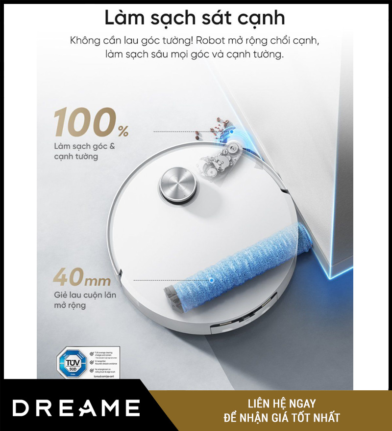 Robot thông thường thường khó làm sạch sát tường và góc khuất, nhưng Dreame Aqua10 Roller khắc phục triệt để với: