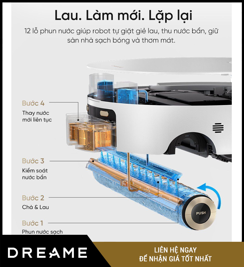 Sự kết hợp này giúp robot không bỏ sót bất kỳ ngóc ngách nào – kể cả khu vực thường phải lau tay như chân bàn, góc tường, mép tủ.