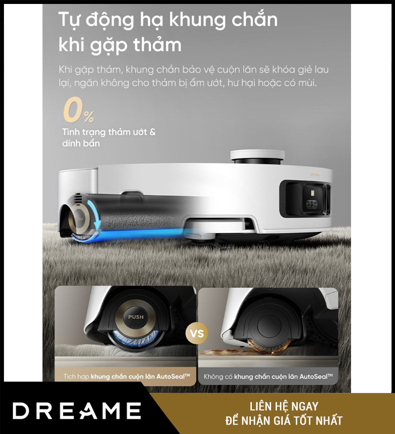 Một trong những nỗi lo lớn nhất khi dùng robot lau sàn là làm ướt thảm. Dreame giải quyết vấn đề này bằng công nghệ thông minh AutoSeal™ Roller Guard: