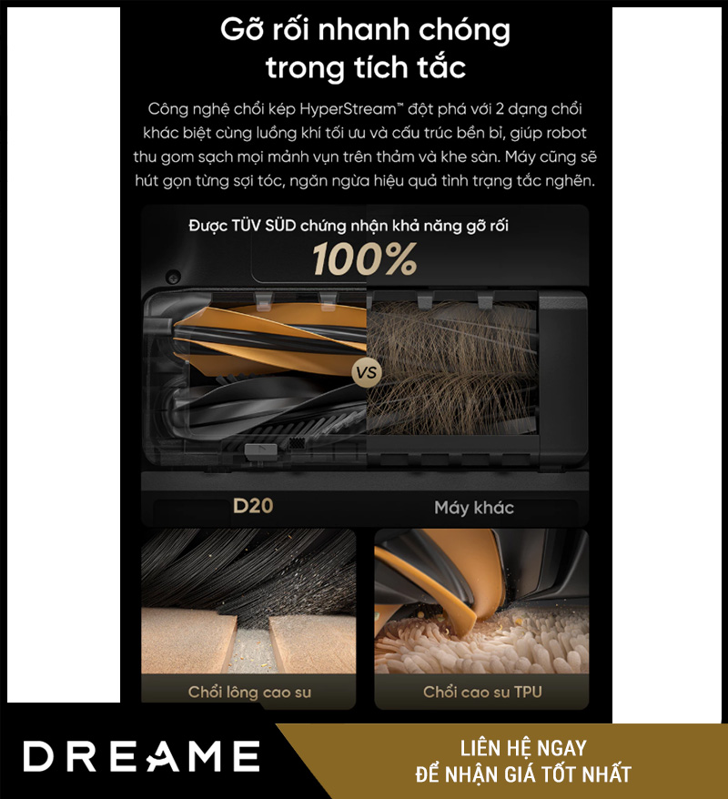 Một trong những điểm khác biệt đáng chú ý của Dreame D20 chính là hệ thống chổi kép HyperStream™.