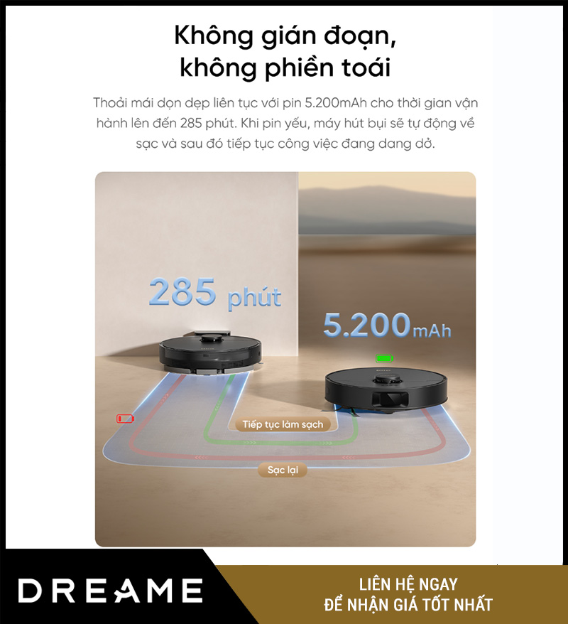 Pin lớn 5.200mAh dọn dẹp không gián đoạn