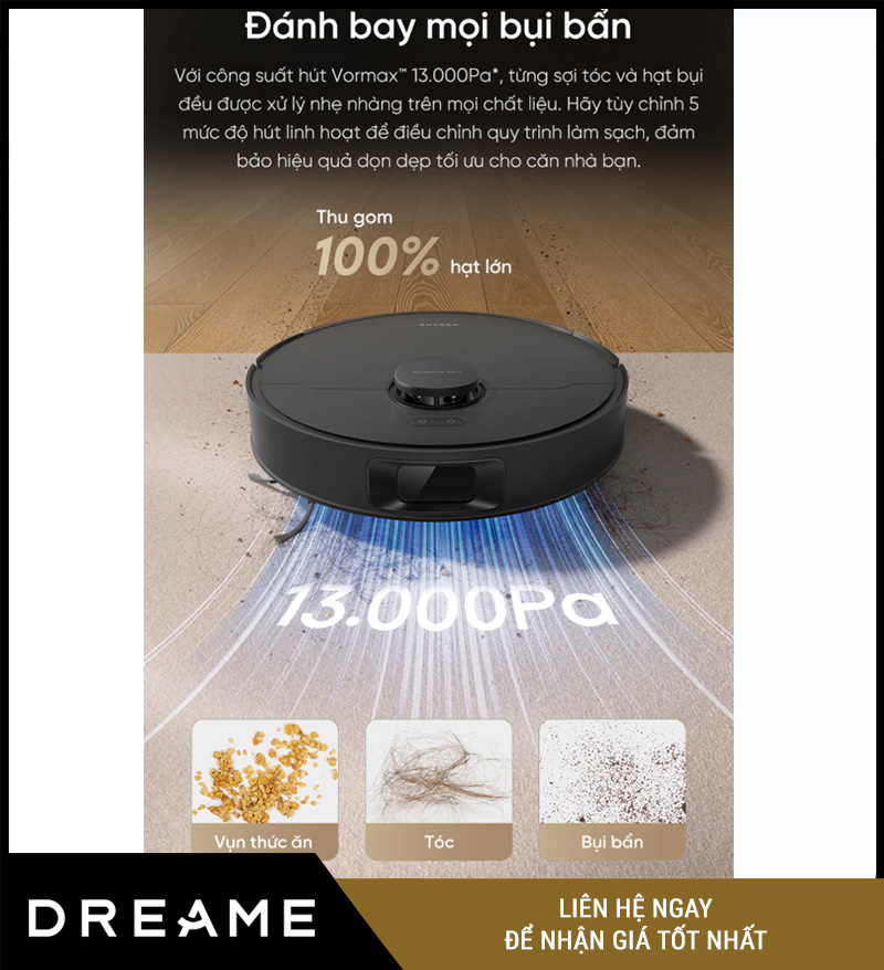 Điểm gây ấn tượng mạnh nhất ở Dreame D20 Robot hút bụi lau nhà chính là lực hút siêu khủng 13.000Pa – cao hơn hẳn nhiều mẫu robot hút bụi trong cùng phân khúc.