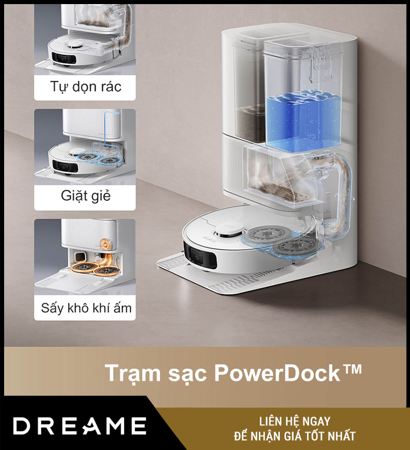 Một trong những điểm đắt giá nhất của Dreame D20 Ultra chính là trạm sạc PowerDock™ thông minh. Đây không chỉ là nơi sạc pin, mà còn là trung tâm xử lý mọi thao tác sau khi robot hoàn thành công việc: