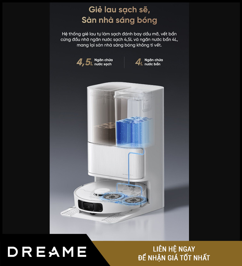 Dreame D20 Ultra đã giải quyết triệt để vấn đề này với hệ thống giặt giẻ tự động tích hợp trong dock PowerDock™.