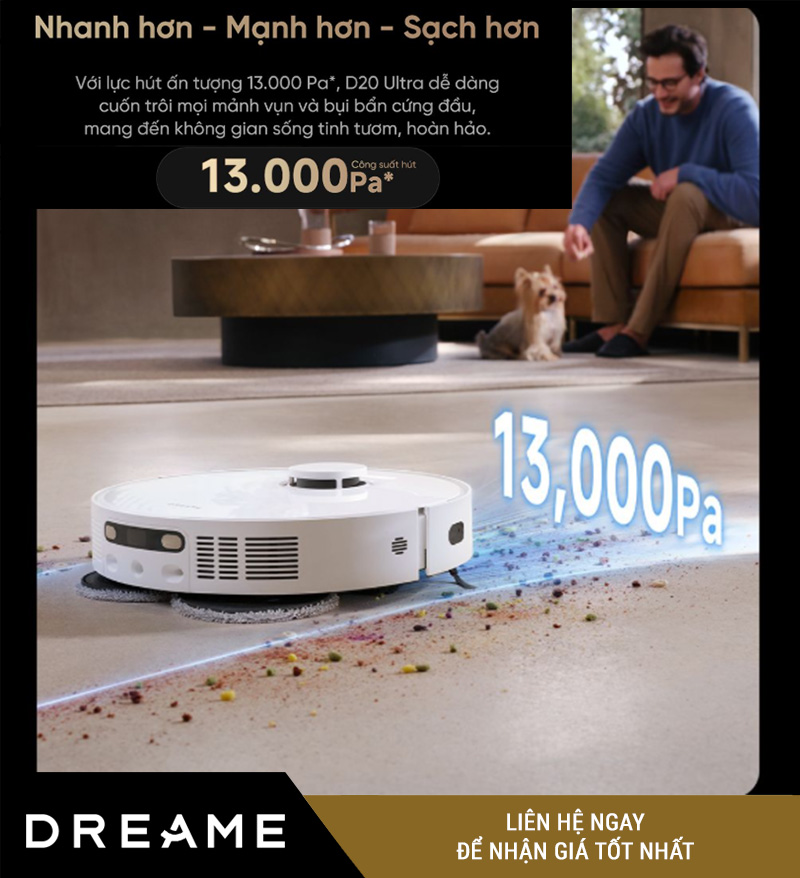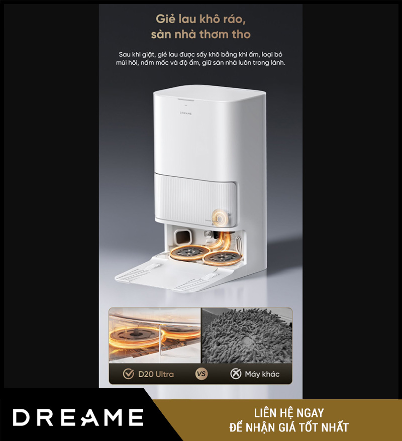 Với 3 tính năng: giặt – sấy – lau xoay, Dreame D20 Ultra đang thuộc top robot lau nhà hiệu quả nhất hiện nay, hoàn toàn phù hợp cho gia đình bận rộn hoặc yêu cầu cao về vệ sinh.