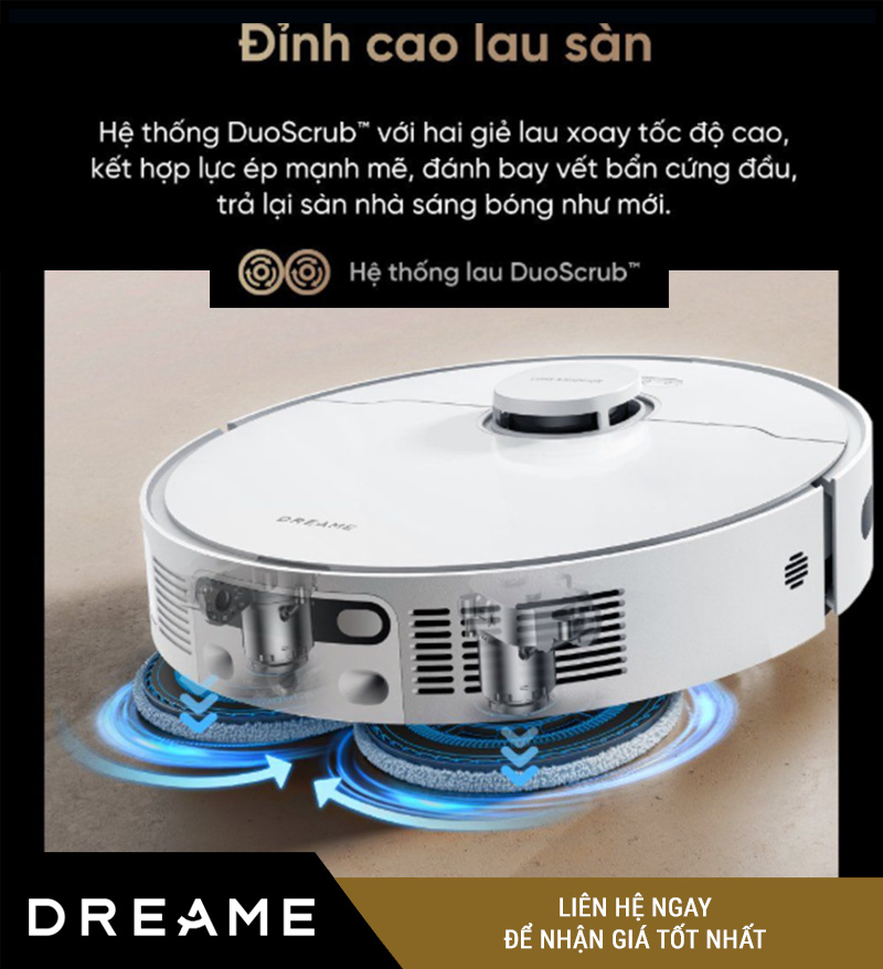 Không chỉ giặt và sấy, Dreame D20 Ultra còn vượt trội nhờ hệ thống lau xoay kép DuoScrub™, giúp robot xử lý các vết bẩn khó nhằn mà các model thông thường thường bỏ sót.
