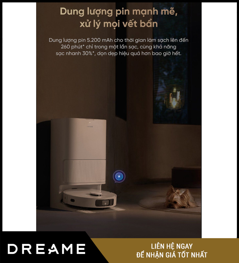 Một trong những yếu tố quan trọng nhất để đánh giá hiệu quả của robot hút bụi chính là thời lượng pin. Dreame D20 Ultra được trang bị pin Li-ion dung lượng lớn 5.200mAh, giúp robot có thể làm sạch liên tục đến 180 phút chỉ với một lần sạc.