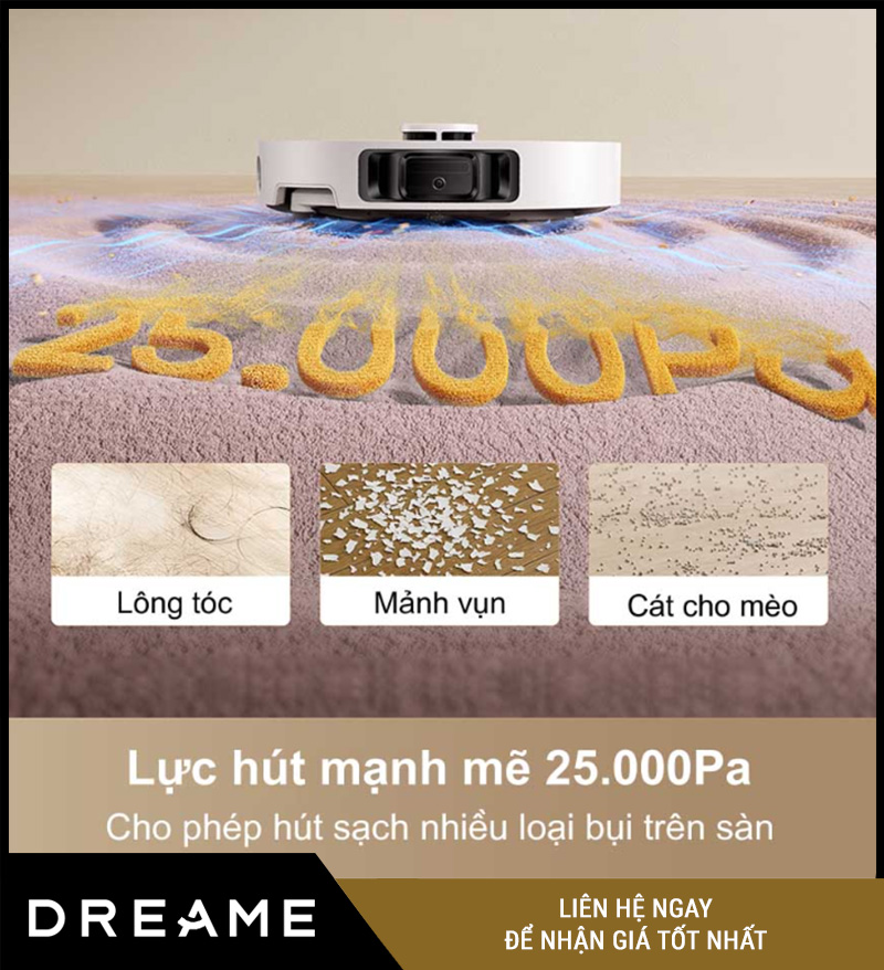 Với lực hút “khủng” 25.000Pa, Dreame Gen 3 là một trong những robot hút bụi mạnh mẽ nhất phân khúc trên 20 triệu, đặc biệt phù hợp với nhà có nhiều lông thú cưng – sàn gồ ghề – không gian lớn.