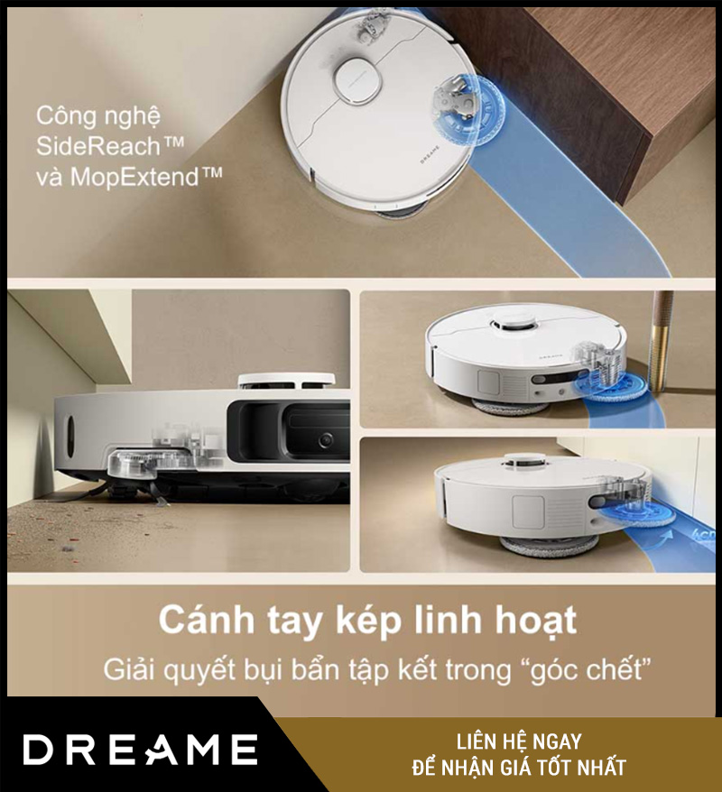 Một trong những vấn đề cố hữu của robot hút bụi là khó làm sạch mép tường, góc nhà, chân tủ, vì chổi cạnh và giẻ lau thường không thể tiếp cận sát hoàn toàn. Dreame đã khắc phục triệt để nhược điểm này với 2 công nghệ: