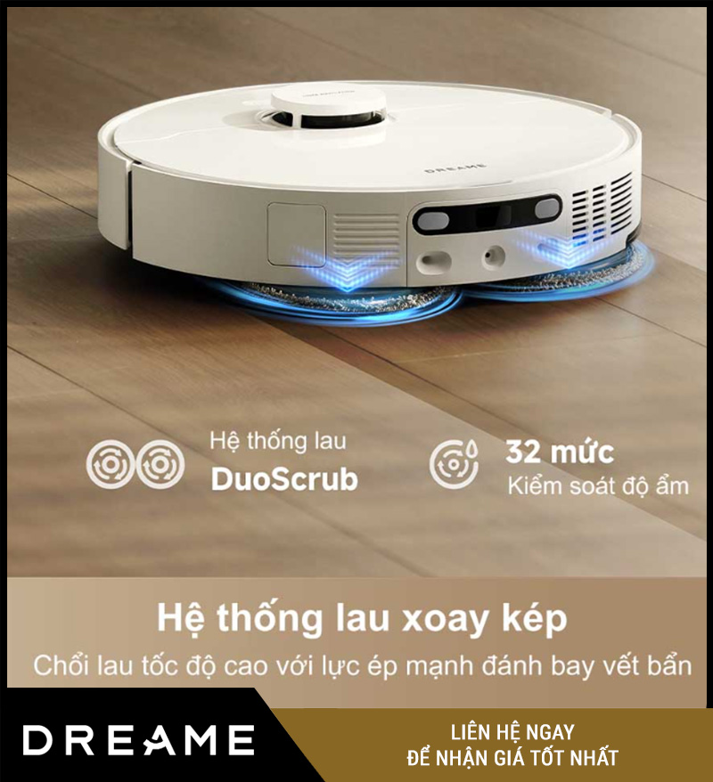 Khác với các robot chỉ lau bằng tấm vải kéo nhẹ, Dreame L10s Ultra Gen 3 trang bị hệ thống lau tiên tiến DuoScrub – sử dụng 2 đĩa lau xoay ngược chiều, tạo lực chà mạnh như tay người.