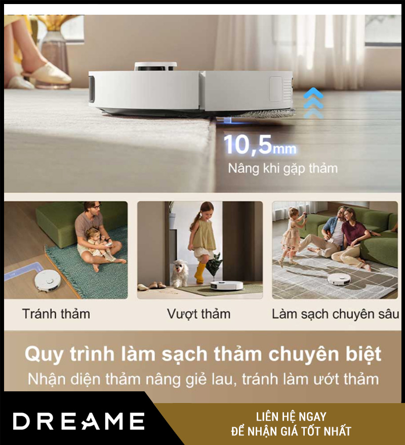 Khi robot phát hiện thảm, giẻ lau sẽ tự động nâng lên ~7mm