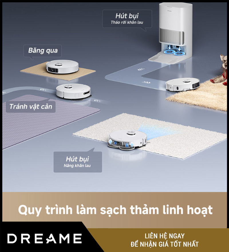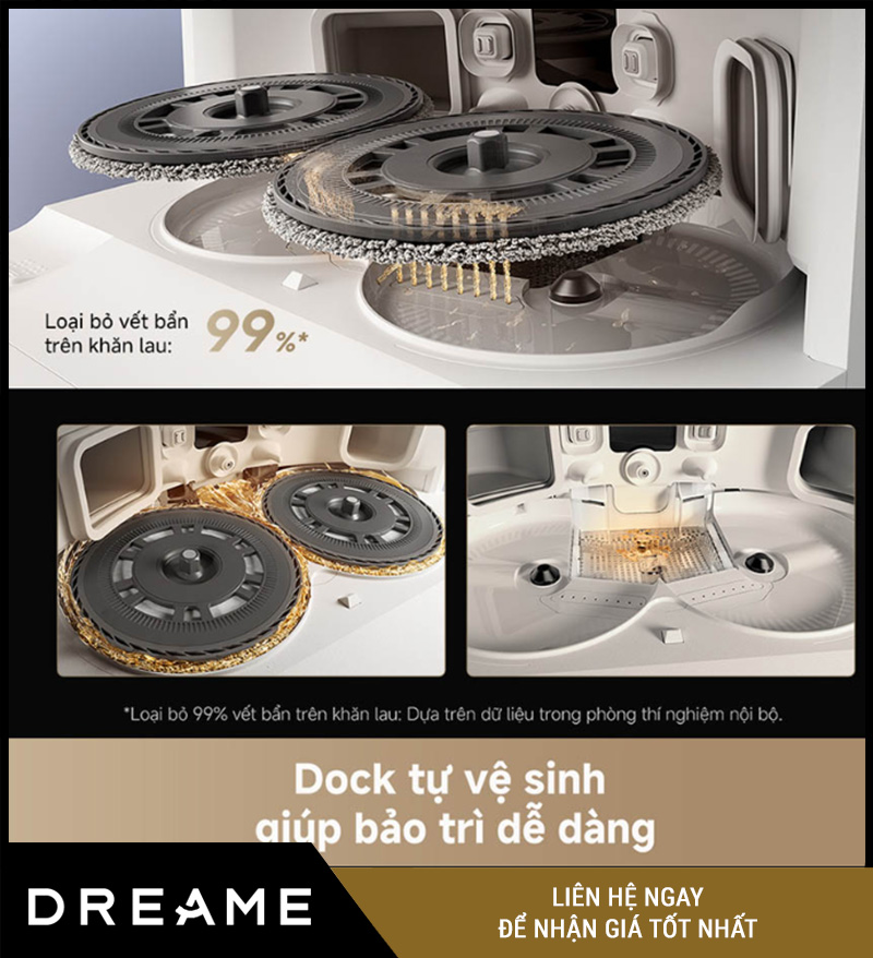 Tự động giặt khăn lau: robot về dock sau mỗi khu lau để rửa khăn bằng nước sạch
