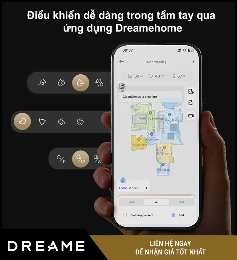 Không cần phải chạm vào robot, không cần remote, chỉ cần điện thoại, bạn đã có thể điều khiển mọi thao tác nhờ ứng dụng DreameHome thông minh (hỗ trợ tiếng Việt):