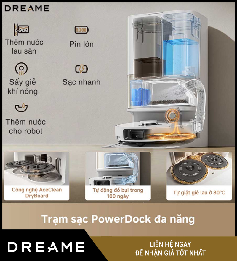 Một điểm nâng cấp cực kỳ đáng giá ở Dreame L50 Ultra CE chính là trạm sạc đa năng PowerDock™, không chỉ đơn thuần để sạc mà là trung tâm xử lý “hậu cần” cho robot: