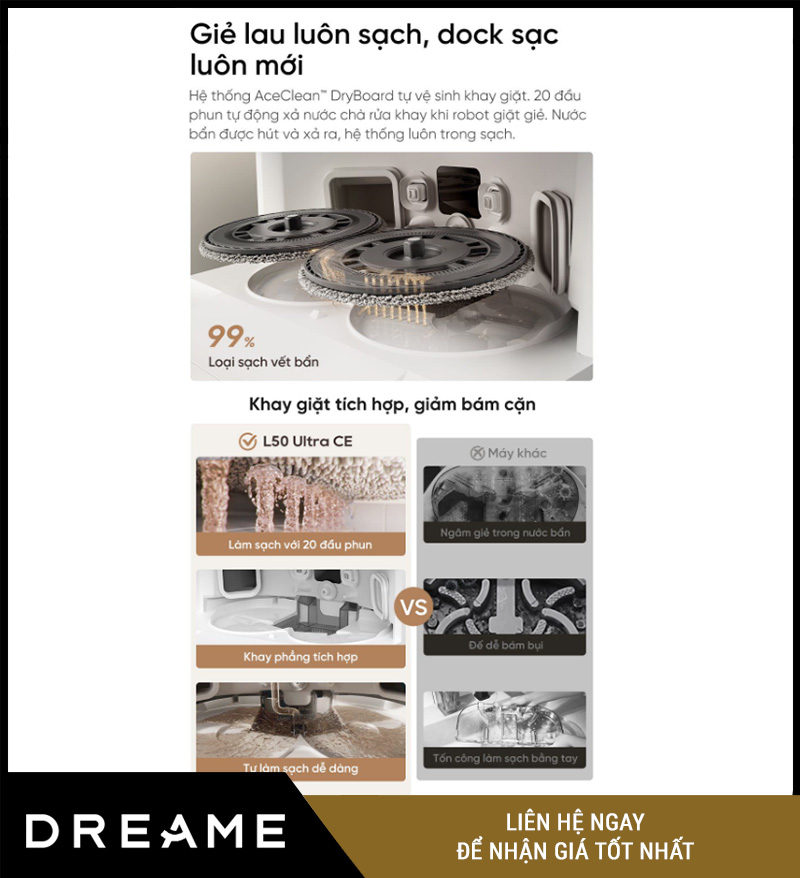 Một vấn đề phổ biến ở các robot lau nhà có trạm giặt giẻ là nước bẩn đọng lại gây mùi hôi và nấm mốc. Dreame L50 Ultra CE khắc phục triệt để nhờ công nghệ AceClean™ DryBoard – hệ thống rửa và sấy khô toàn bộ bề mặt đế sạc sau mỗi lần robot quay về trạm.