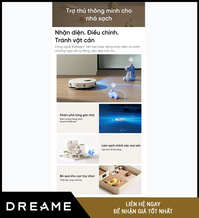 Không gì khó chịu hơn việc robot cứ va vào chân ghế, mắc dây điện hay hút nhầm đồ chơi. Đó là lý do Dreame L50 Ultra CE được trang bị hệ thống điều hướng 3DAdapt™ AI, sử dụng kết hợp: