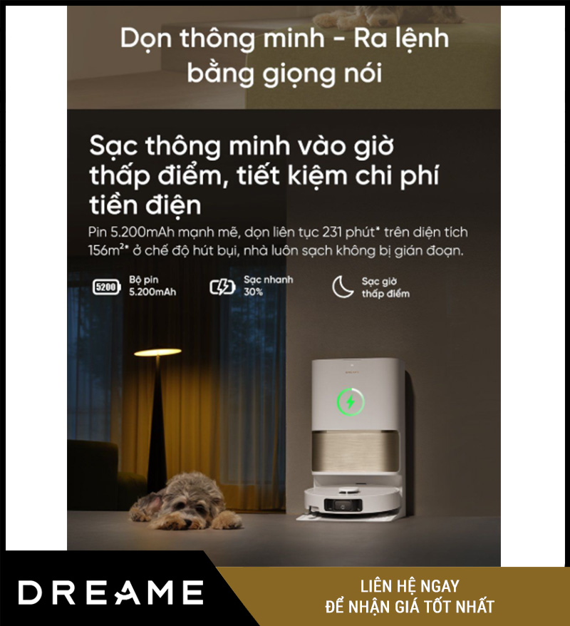 Dung lượng pin này cực kỳ phù hợp với nhà nhiều tầng, biệt thự hoặc căn hộ rộng – giúp robot làm sạch liên tục mà không bị gián đoạn giữa chừng.