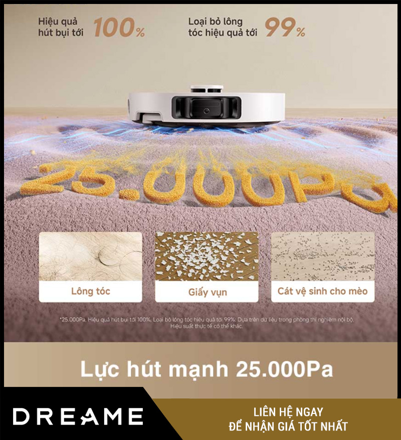 Lực hút 25.000Pa đủ mạnh để gom sạch bụi mịn và vụn thức ăn nhỏ