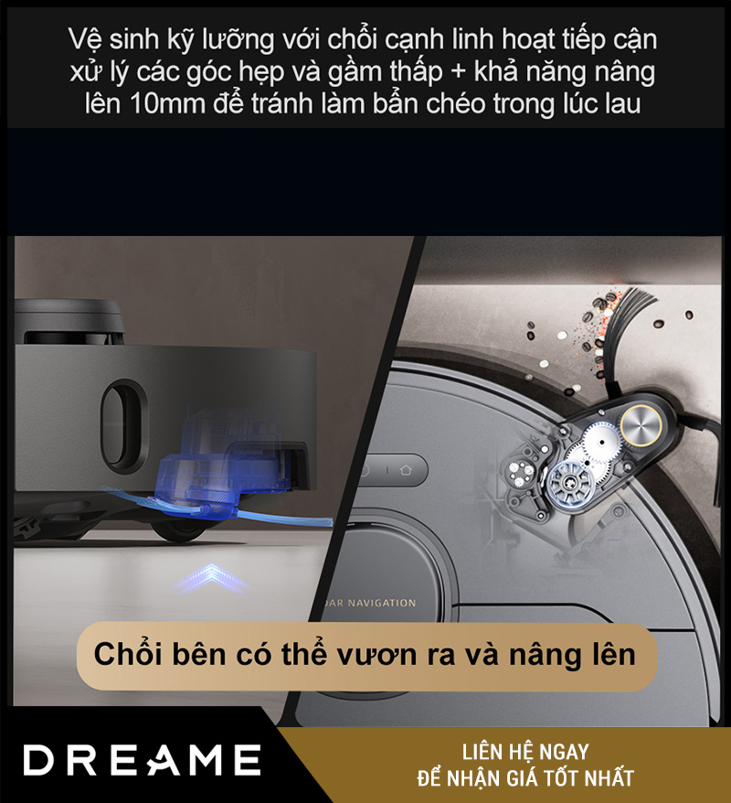 Khi gặp mép tường hoặc góc cạnh, robot sẽ kích hoạt cơ chế mở rộng cánh tay lau sang một bên → giúp giẻ tiếp cận sát chân tường hoặc các điểm khuất.