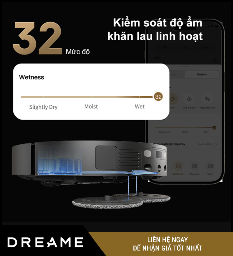 Không phải sàn nào cũng chịu được lượng nước lớn. Với 32 cấp độ điều chỉnh độ ẩm giẻ lau, Dreame X40 Master cho phép người dùng: