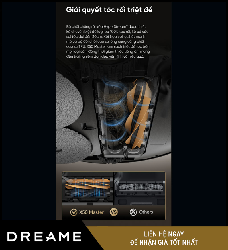 Nếu bạn từng phải gỡ tóc rối khỏi chổi robot sau vài ngày sử dụng, bạn sẽ hiểu tầm quan trọng của công nghệ chổi chống rối. Với Dreame X50 Master, vấn đề này được giải quyết triệt để nhờ hệ thống chổi kép HyperStream™ – thiết kế đặc biệt dành riêng cho nhà có phụ nữ tóc dài hoặc nuôi thú cưng.
